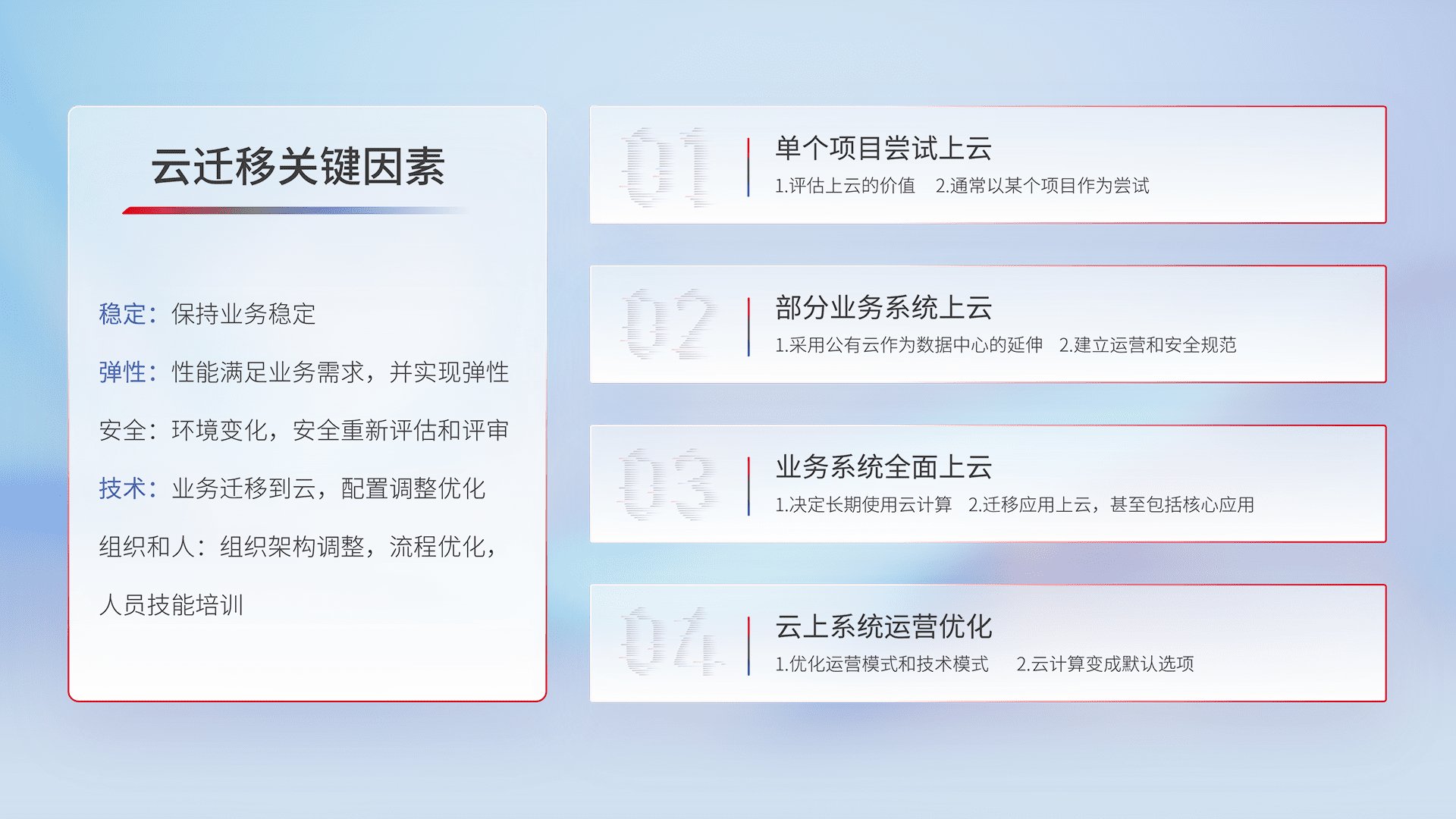 结合实际业务,,,从规划设计、、、云平台选型、、、云原生改造、、、、数据迁移、、、、集成交付,,,,迁移全过程为客户识别最佳上云路径,,,做好风险识别管理,,,,设计网络架构、、、、身份权限、、、、安全审计合规、、、、操作审计、、、日志审计、、、监控告警策略、、、、多站点容灾设计等,,对云上基础设施进行整体规划,,,,提升IT治理水平,,,,以满足弹性、、、高可用、、高性能的需求。。
